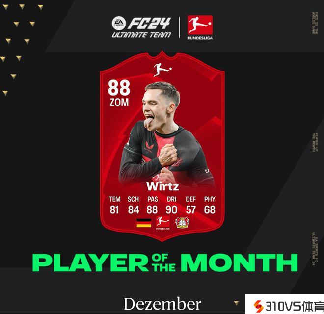 4场2球2助!官方:维尔茨中选德甲12月最佳,击败凯恩、西蒙斯等