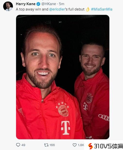 凯恩晒与戴尔合照:出色的客场成功,戴尔为拜仁初次踢满全场