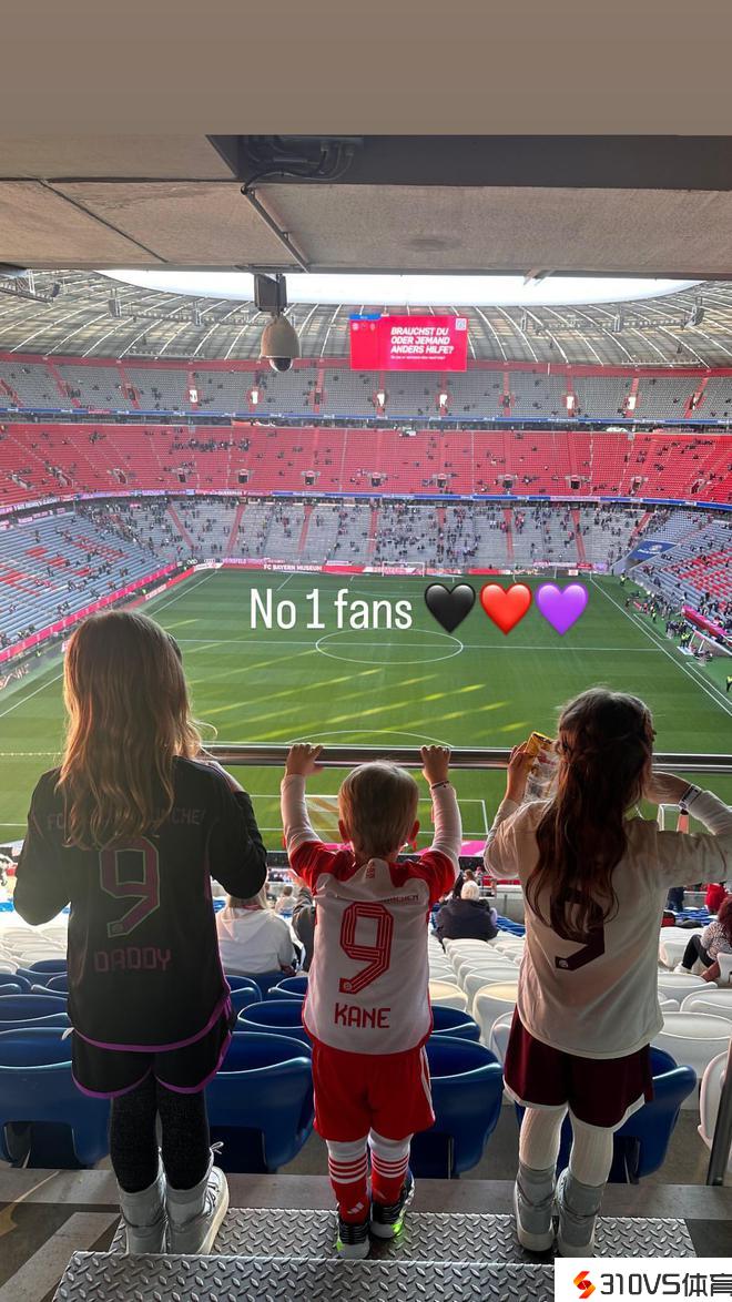 孩子们身穿着凯恩的球衣为父亲加油。凯特写道:“一号球迷们。”