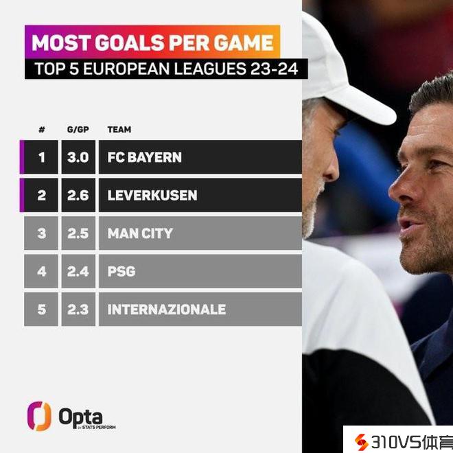 五大联赛球队场均进球数TOP5:拜仁、药厂、曼城、巴黎、国米