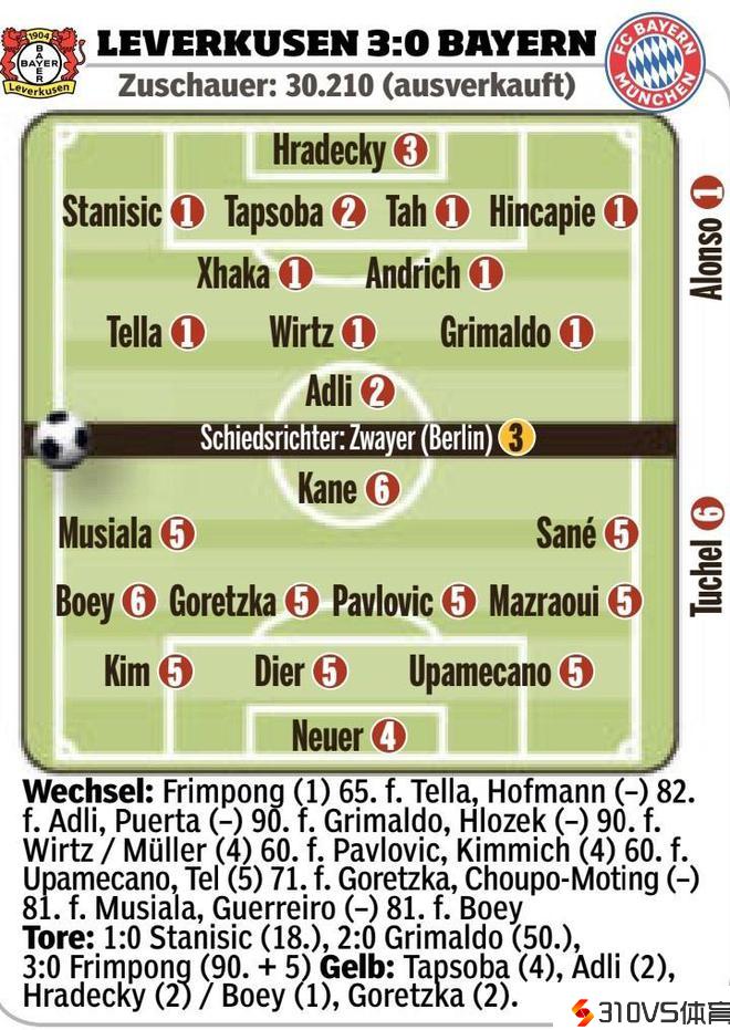 勒沃库森首发:赫拉德茨基(3分)、斯坦尼西奇(1分)、塔普索巴(2分)、塔(1分)、因皮卡耶(1分)、扎卡(1分)、安德里希(1分)、泰拉(1分)、维尔茨(1分)、格里马尔多(1分)、阿德利(2分)