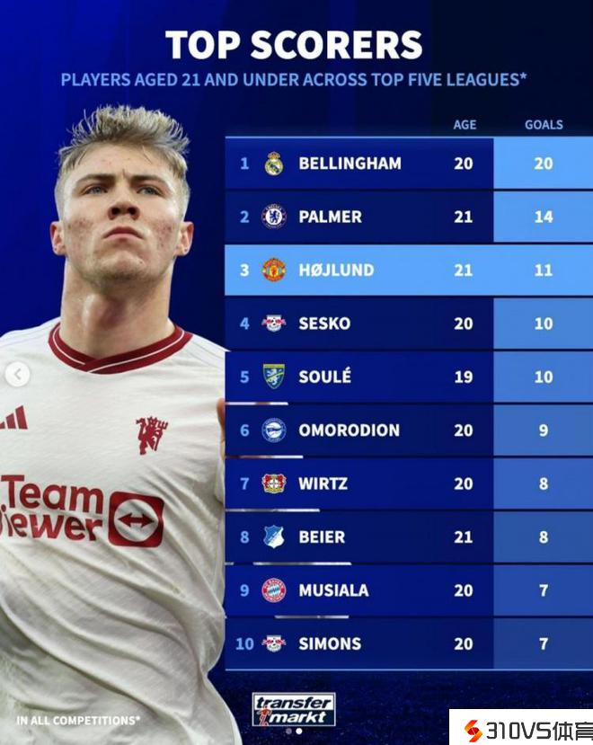 本赛季U21球员进球榜:贝林厄姆20球居首,帕尔默次席&霍伊伦第三