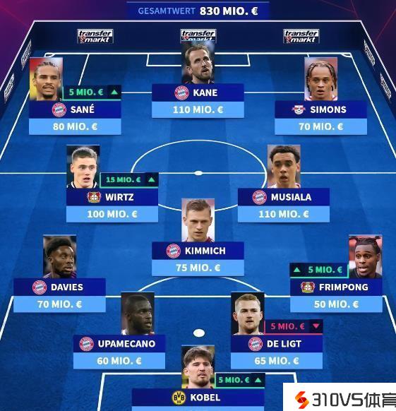 德转所列出的目前德甲最贵阵容,总身价到达8.3亿欧元。区分是门将位置上的科贝尔(多特,4000万欧元);后防线上的阿方索-戴维斯(拜仁,7000万欧元)、于帕梅卡诺(拜仁,6000万欧元)、德利赫特(拜仁,6500万欧元)、弗林蓬(勒沃库森,5000万欧元);中场的基米希(拜仁,7500万欧元)、维尔茨(勒沃库森,1亿欧元)、穆西亚拉(拜仁,1.1亿欧元);前锋上的萨内(拜仁,8000万欧元)、凯恩(拜仁,1.1亿欧元)、哈维-西蒙斯(莱比锡,7000万欧元)。