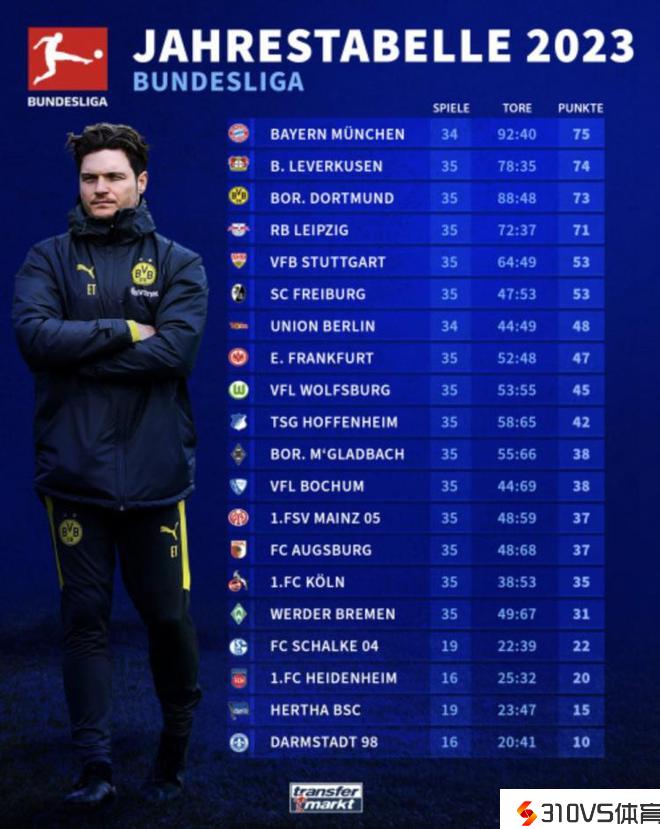 德甲2023年度积分榜:拜仁75分第一,药厂74&多特73列二三位