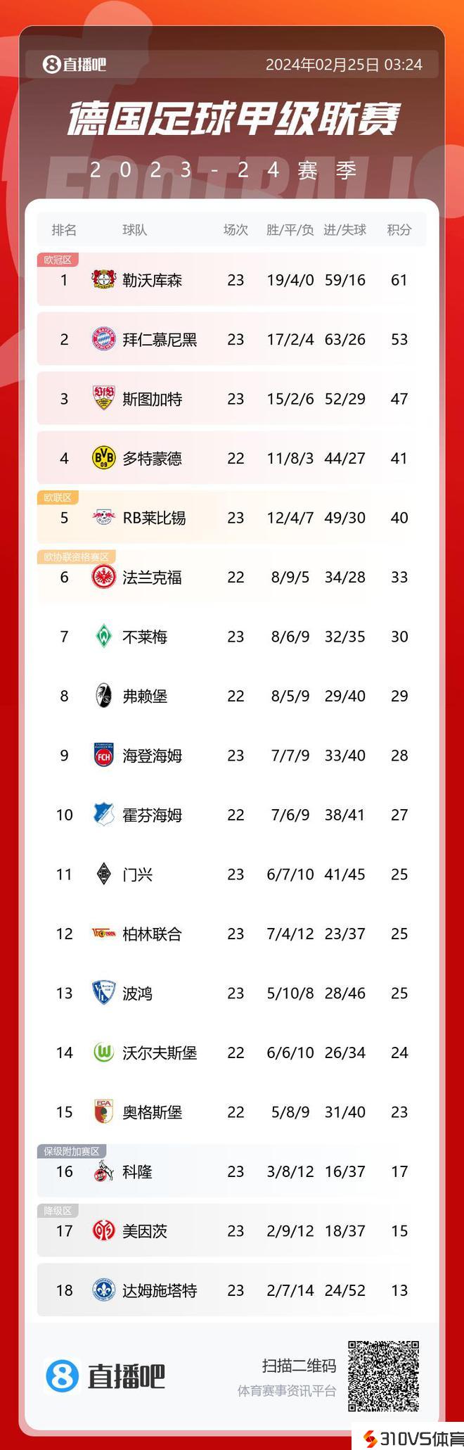 德甲积分榜:拜仁终止各赛事3连败,排名第二距榜首8分