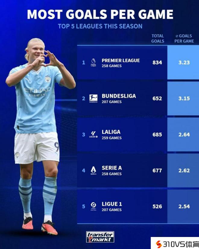 本赛季五大联赛场均进球数:英超3.23球居首,德甲次席&西甲第三