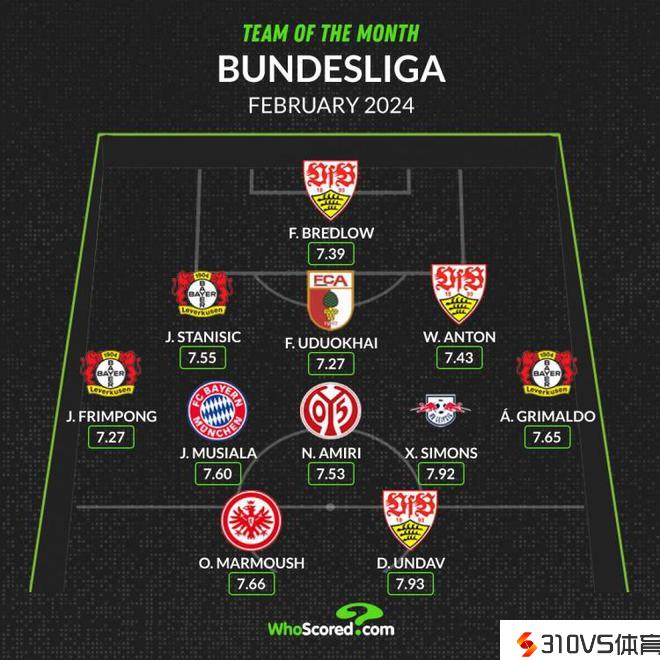 WhoScored德甲2月最佳阵:穆西亚拉、西蒙斯在列,药厂3人中选