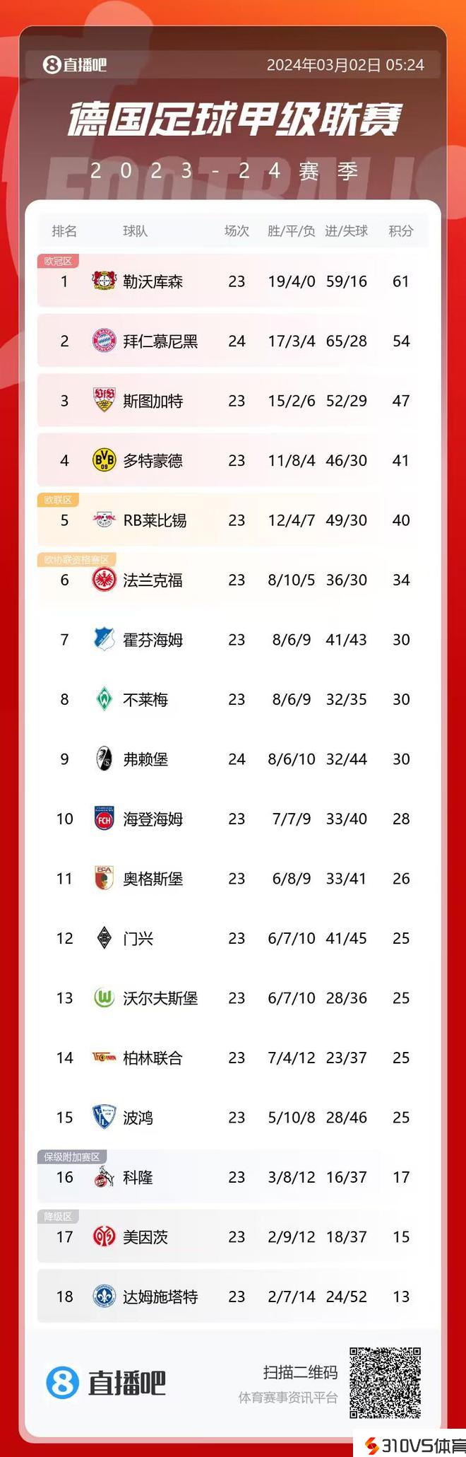 德甲积分榜:拜仁遭绝平,先赛1场落后药厂7分