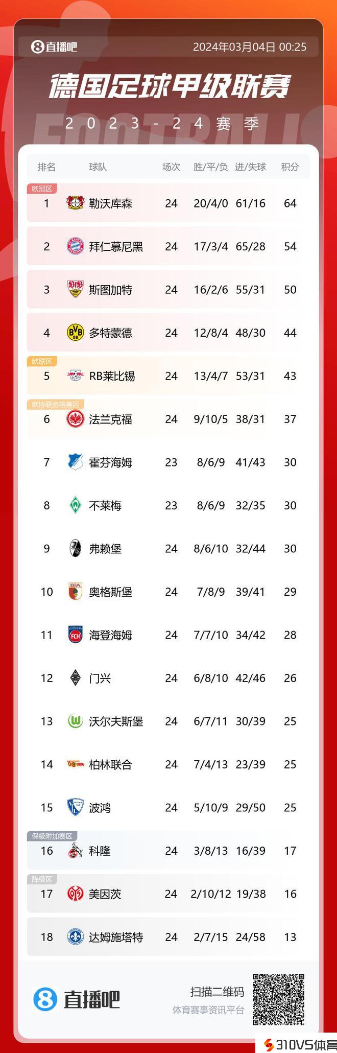 德甲积分榜:勒沃库森赢球后战绩20胜4平,抢先拜仁10分领跑