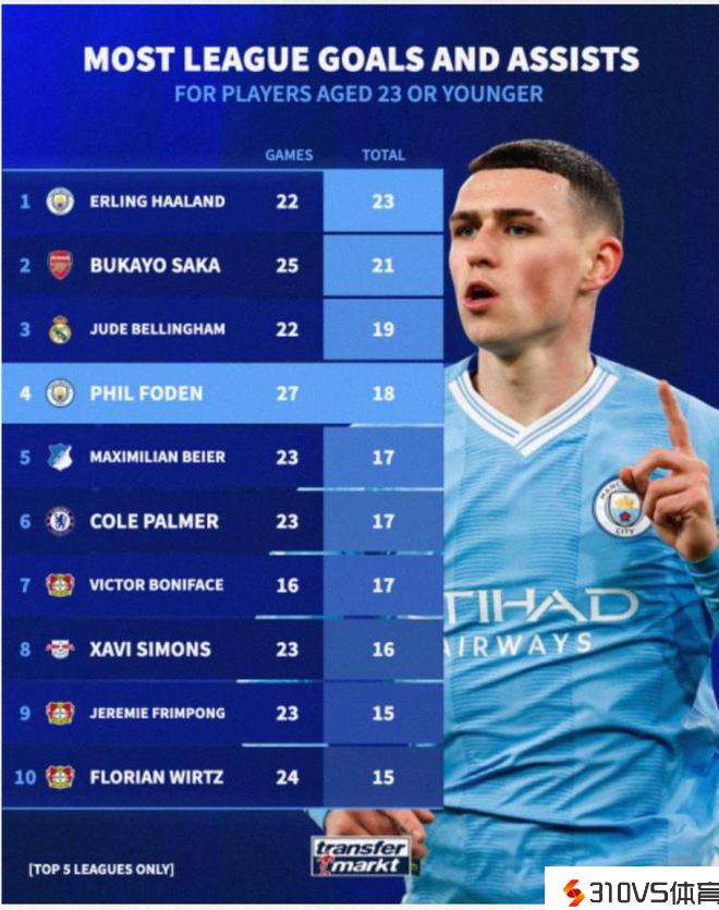 本赛季五大联赛U23球员参与进球榜:哈兰德23球居首,萨卡次席