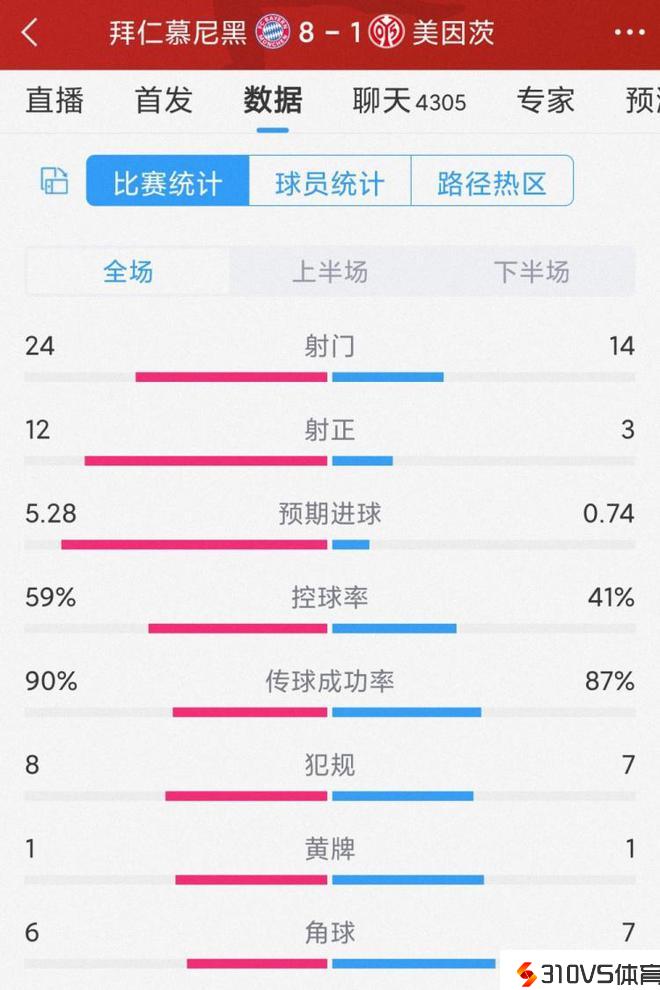 在本轮德甲联赛,拜仁8-1狂胜美因茨,以下为双方全场数据对比: