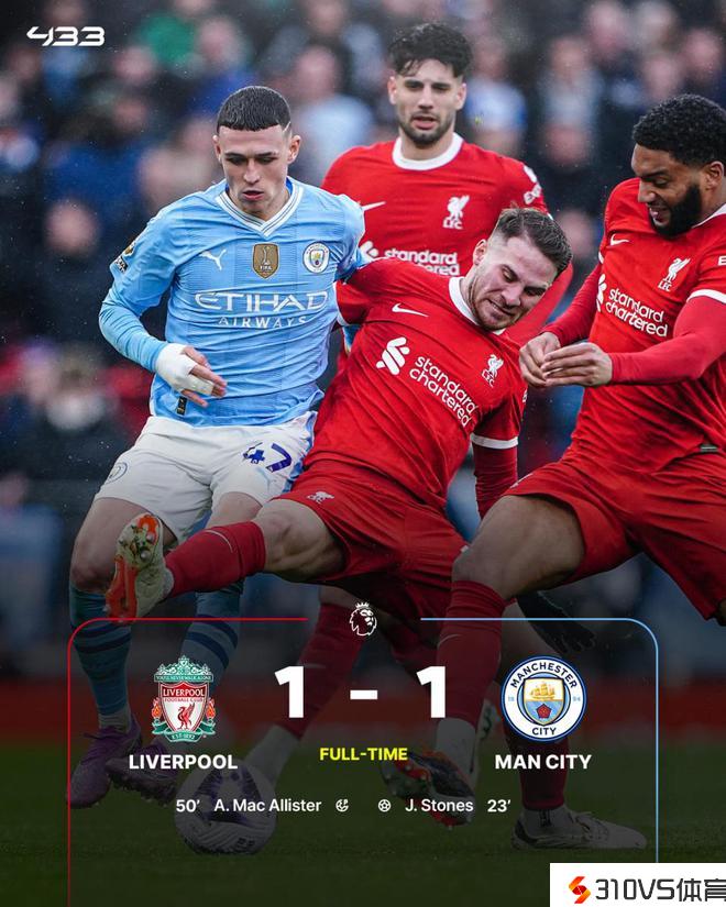 英超第28轮,利物浦主场1-1战平曼城,区分积64分、63分排名二三位,阿森纳64分仰仗净胜球优势居首。德布劳内角球助攻斯通斯先拔头筹。阿克回传失误,埃德森送点后伤退,麦卡利斯特主罚点球扳平,迪亚斯两次错失绝佳时机,福登、多库先后中框。