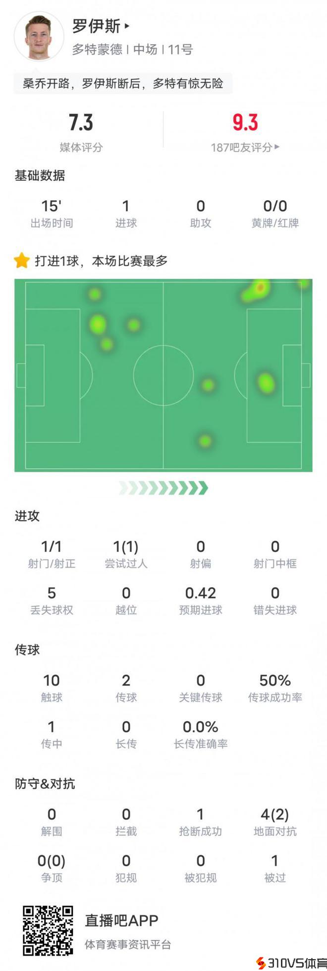 罗伊斯本场竞赛数据:1射正1进球1过人成功,评分7.3