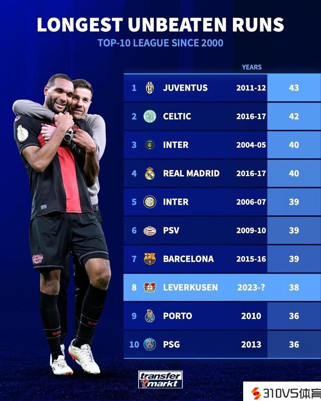 本世纪十大联赛最长不败排行:尤文43场居首,药厂38场列第八