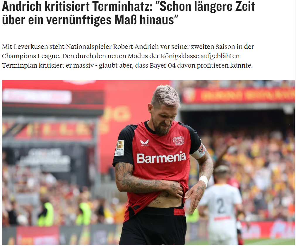 在接受德国媒体采访时,勒沃库森中场罗伯特-安德里希表示,欧足联和FIFA为了钱不断增加赛程,完全是不顾球员死活,不过安德里希也认为,新赛季多线出击的勒沃库森因为人员储备的厚度很可能受益。