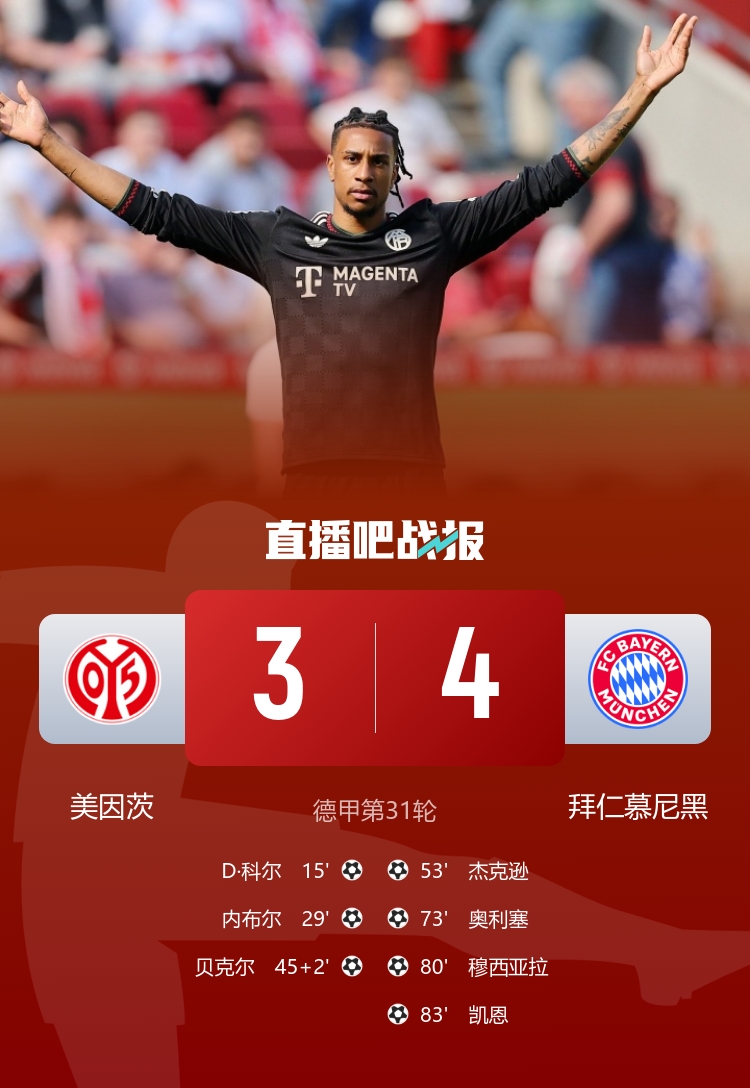 4月25日讯 北京时间4月25日晚上21:30,德甲第31轮,拜仁慕尼黑做客欧宝竞技球场挑战美因茨。上半场,D·科尔凌空斩,内布尔破门,乌尔比希屡献神扑,贝克尔再下一城。下半场,莱默尔助攻杰克逊扳回一球,奥利塞世界波,穆西亚拉扳平,凯恩进球反超。全场比赛结束,拜仁慕尼黑4-3美因茨。本场过后,拜仁慕尼黑积82分继续排名第1,美因茨积34分排第10。
