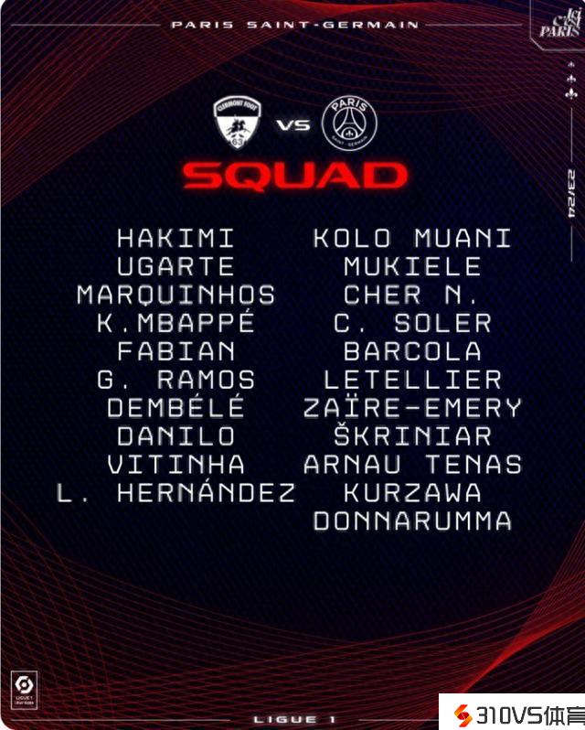 巴黎对克莱蒙大名单:姆巴佩、登贝莱在列,李刚仁参与亚运会