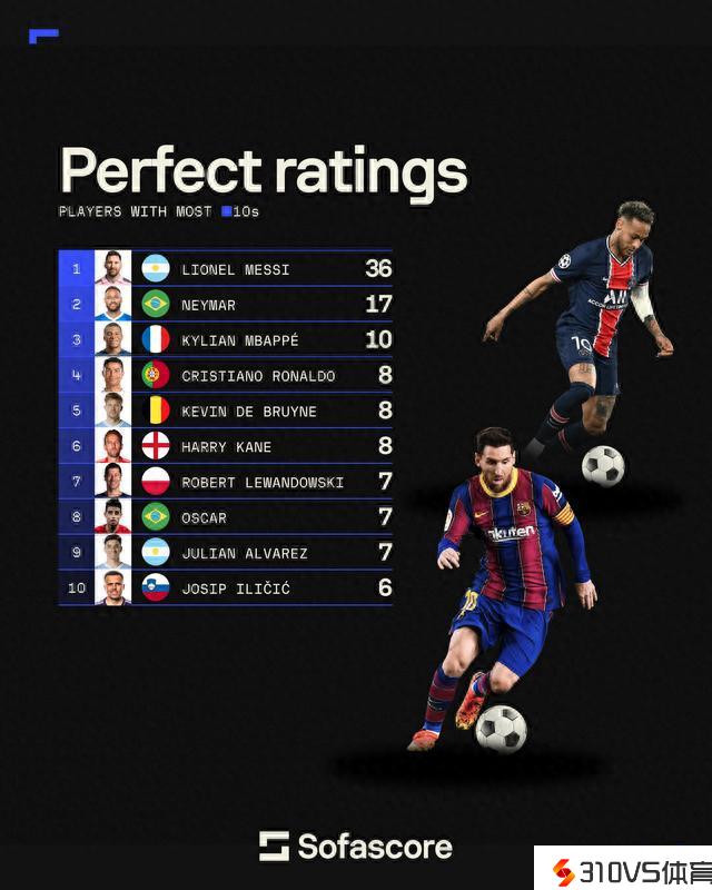 王中王!Sofascore获评10分次数:梅西36次断层领跑,姆巴佩第三