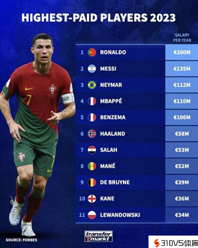 2023球员年薪排行:C罗2亿第一,姆巴佩为前五独一五大联赛球员