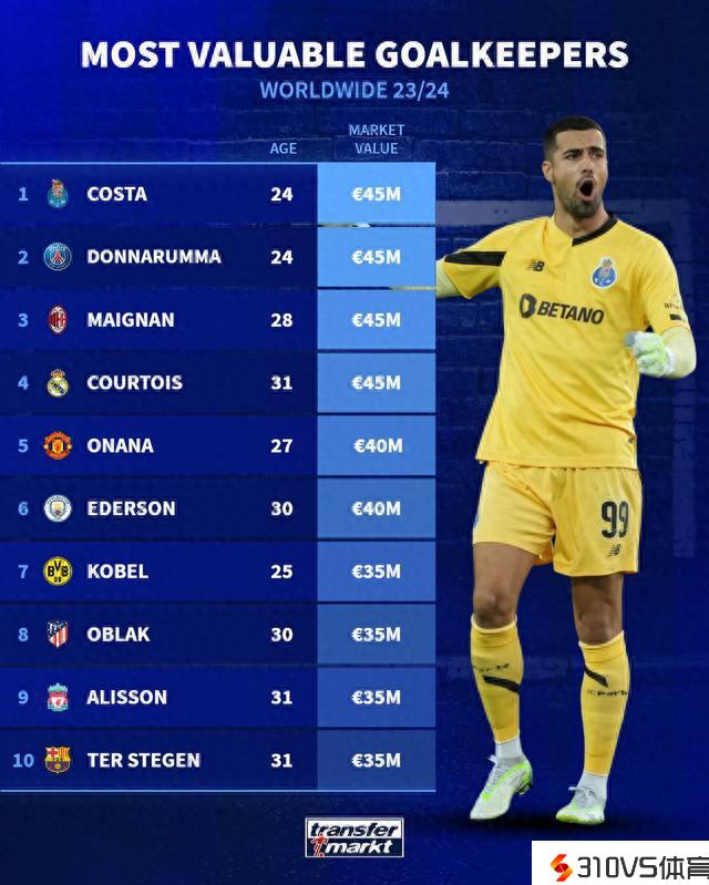 德转门将身价榜:最高4500万欧,多纳鲁马、迈尼昂、库瓦并列榜首