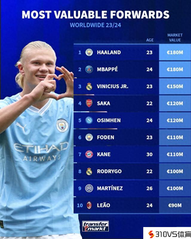 德转本赛季身价前十位前锋:哈兰德姆巴佩1.8亿欧,小熊1.5亿