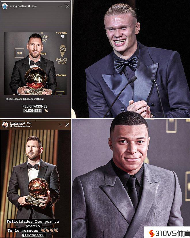尊重梅西获金球奖后哈兰德、姆巴佩都在社媒向他表示了祝贺