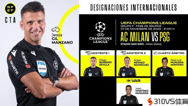 官方:西班牙名哨希尔-曼萨诺将执法米兰vs巴黎