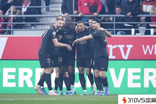 姆巴佩(右三)与队友庆贺进球。图片来自法甲联赛官方社交媒体