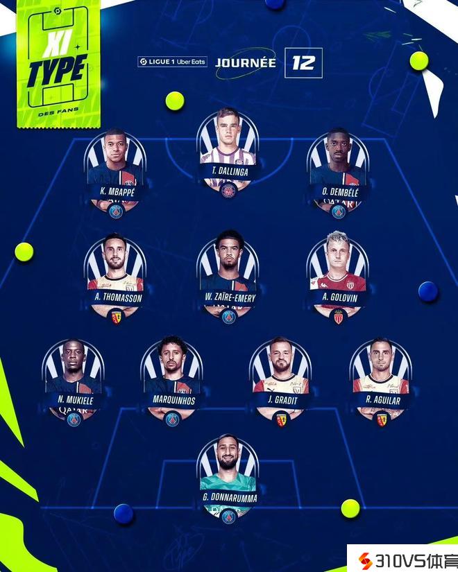 法甲第12轮最佳阵容:大巴黎六人中选,戈洛温在列