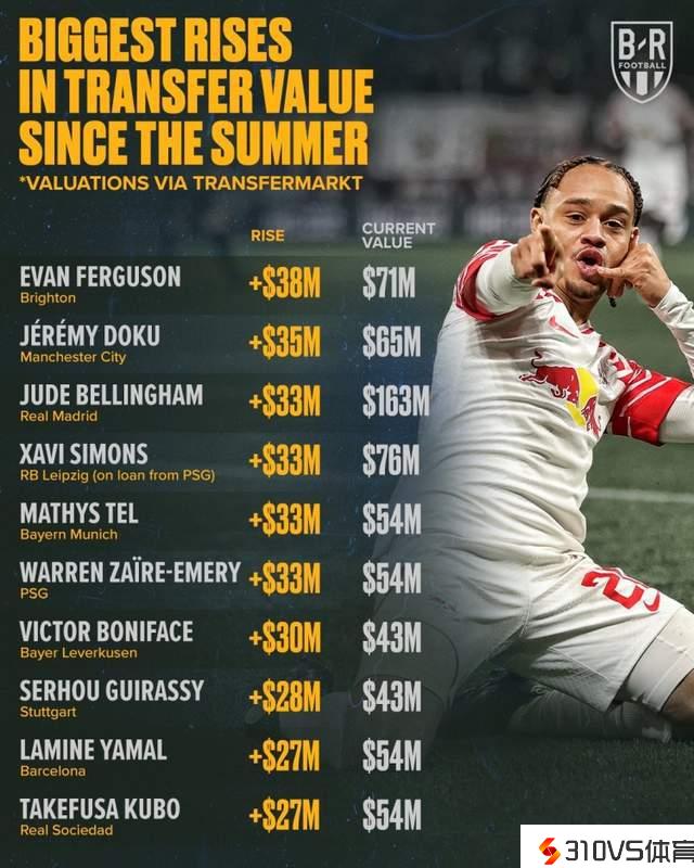 本赛季身价提升TOP10:贝林久保亚马尔在列,英超顶级妖星领跑