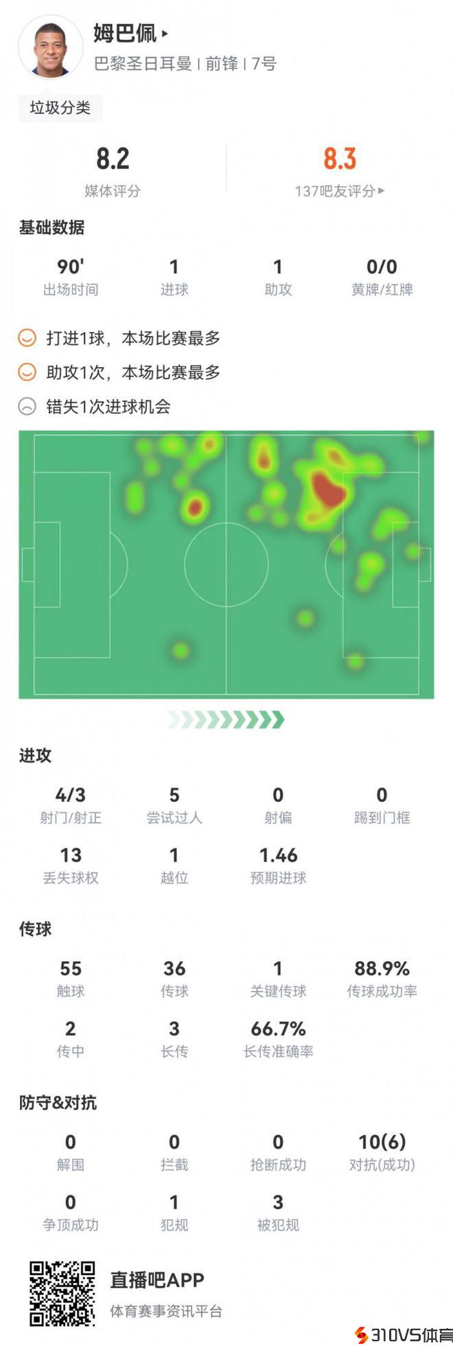 姆巴佩数据:1进球1助攻 错失1次得分时机 评分8.2分仅次登贝莱