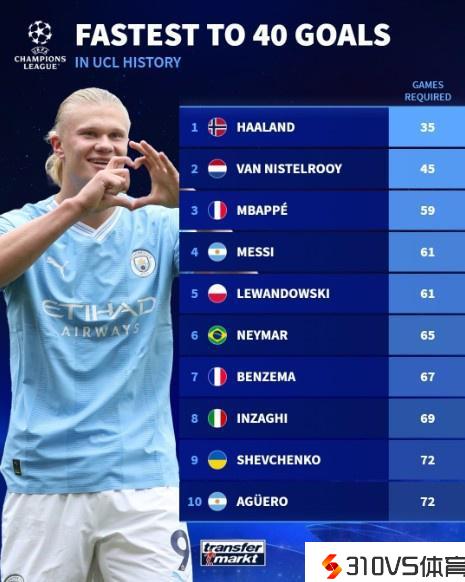 球员欧冠40球所用场次排名前十:范尼第二,姆巴佩&梅西三四位
