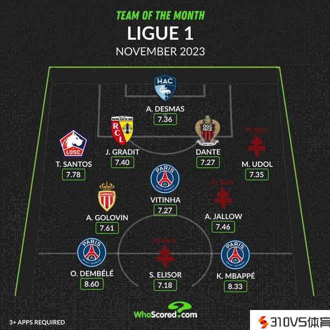 WhoScored法甲11月最佳阵:登贝莱、姆巴佩领衔