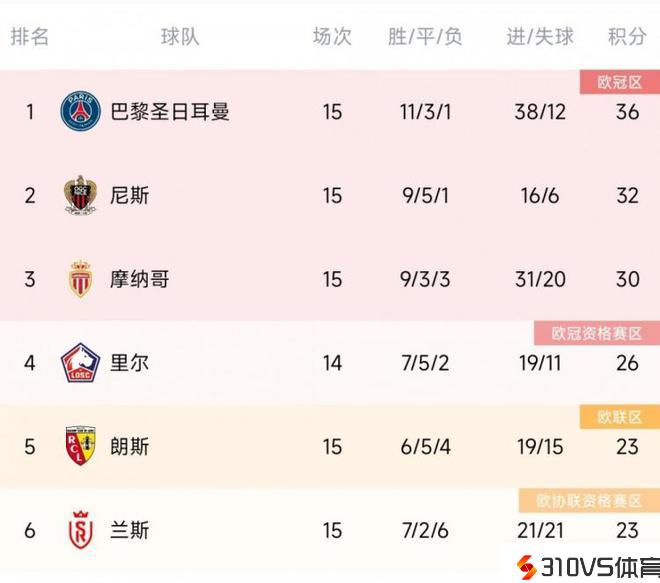 9胜5平1负!尼斯本赛季法甲前15轮积32分,队史同期第三多
