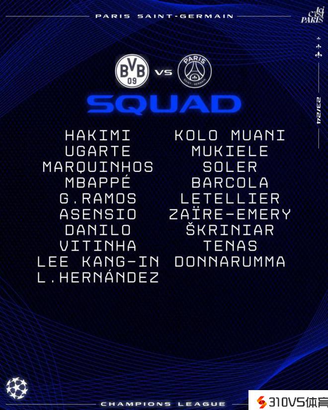 巴黎客战多特大名单:姆巴佩、阿什拉夫在列,登贝莱停赛列席