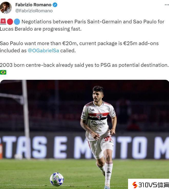 罗马诺:巴黎有意引进圣保罗中卫贝拉尔多,对方要价超2000万欧