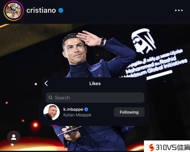C罗社交媒体晒出环球足球奖,姆巴佩点赞