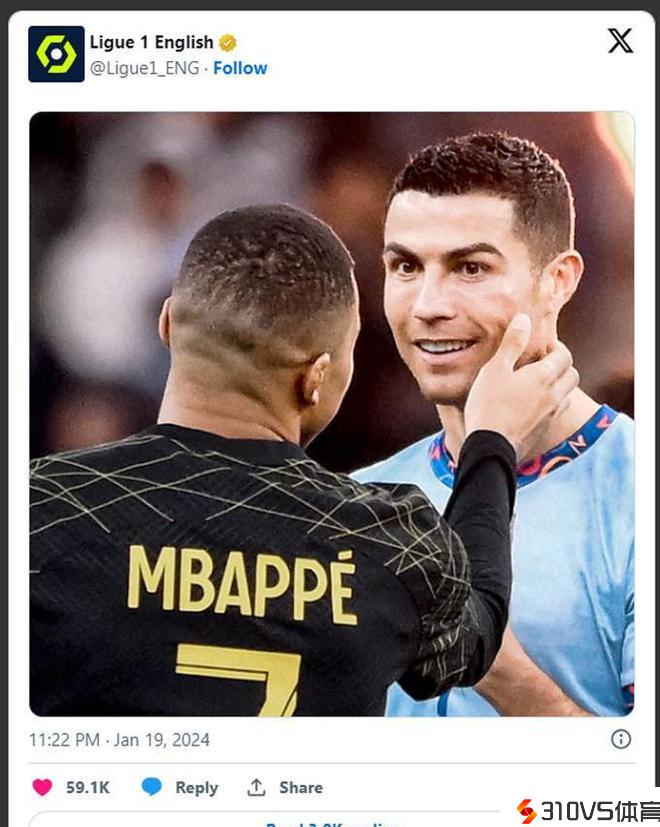 旋即,C罗的言论失掉了法甲的回应。法甲只发布了一张姆巴佩抚摸C罗面颊的照片,没有任何形状。