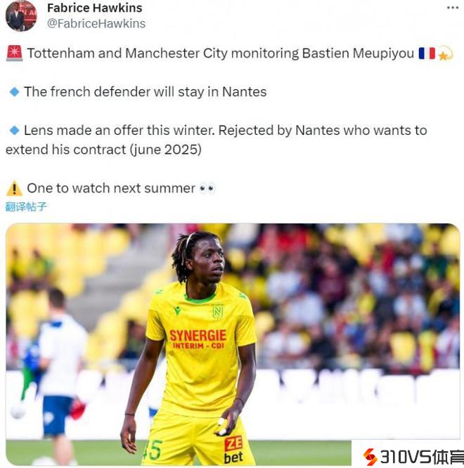 记者:热刺&曼城关注南特17岁后卫梅乌皮尤,但本赛季估量留队