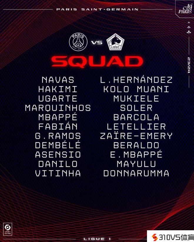 巴黎联赛战里尔大名单:姆巴佩领衔锋线,马尔基尼奥斯坐镇后防