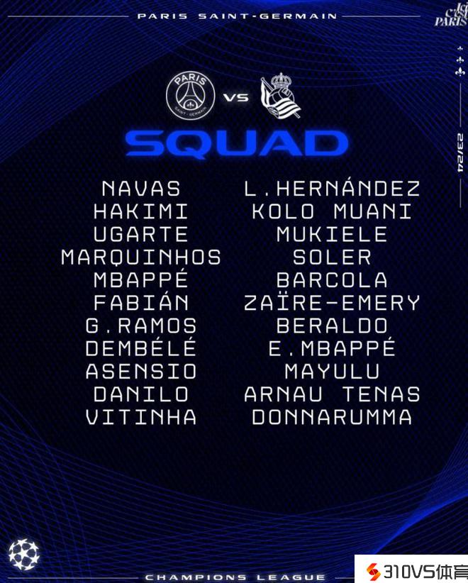 巴黎欧冠战皇家社会大名单:姆巴佩领衔锋线,登贝莱阿森西奥在列