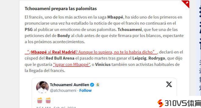 此前,2月14日,欧冠16强首回合皇马1-0打败莱比锡后,楚阿梅尼也地下谈到姆巴佩:“姆巴佩来皇马的音讯?他没有通知我任何事情,”法国球员泄漏。