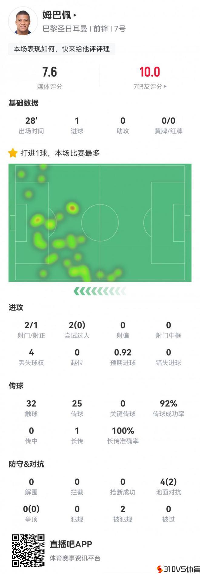 姆巴佩本场数据:2射1正,1次造点1粒进球,获评7.6分