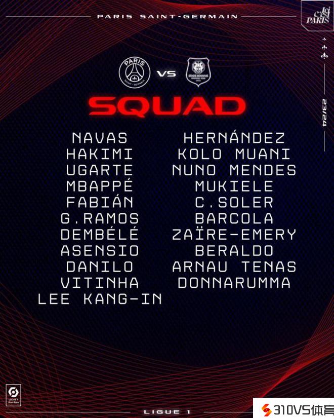 巴黎战雷恩大名单:姆巴佩领衔,努诺-门德斯时隔近十个月复出