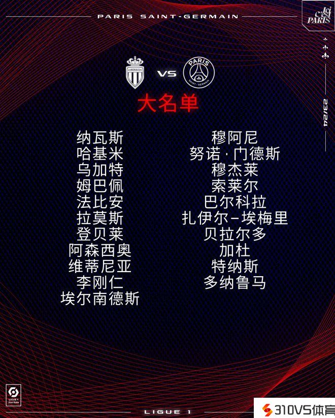 大巴黎 摩纳哥 法甲大名单发布
