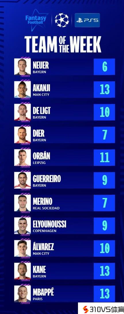 欧冠本周最佳阵容:凯恩&姆巴佩领衔锋线,阿坎吉&德里赫特在列