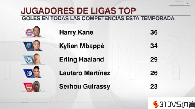 本赛季五大联赛球员射手榜:凯恩36球居首,姆巴佩34球次席