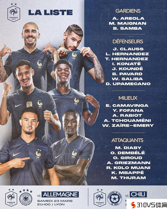法国队发布大名单:姆巴佩、格列兹曼领衔,拉比奥带伤中选