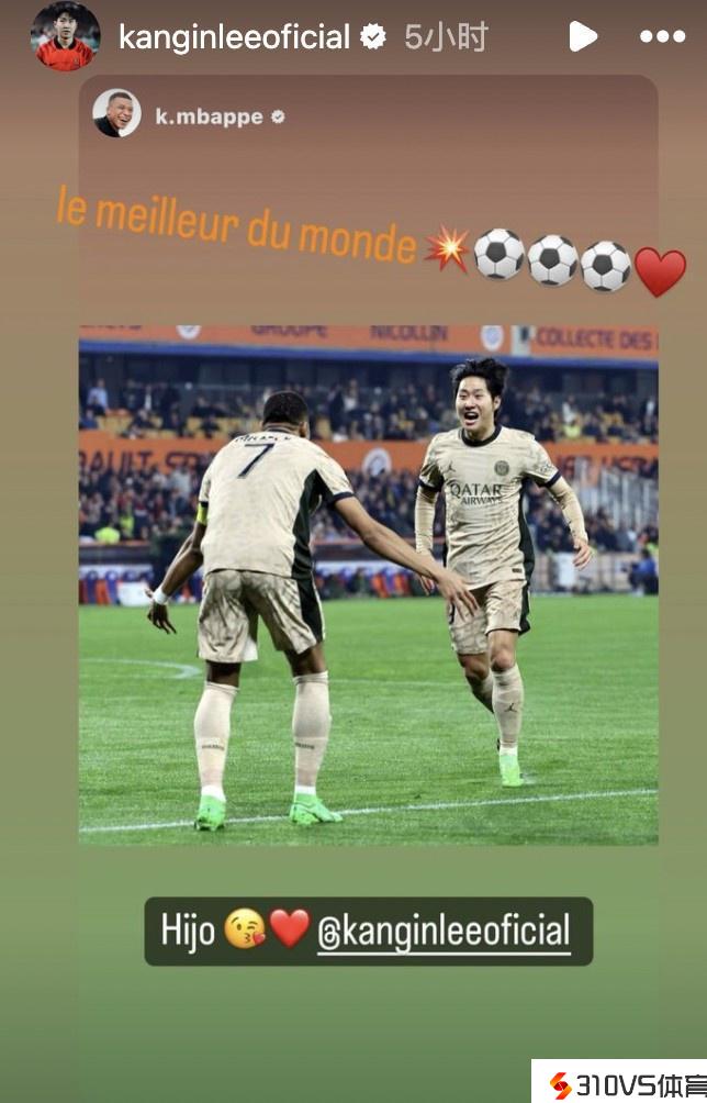 李刚仁转发与姆巴佩互动态态:世界最佳❤️⚽️⚽️⚽️