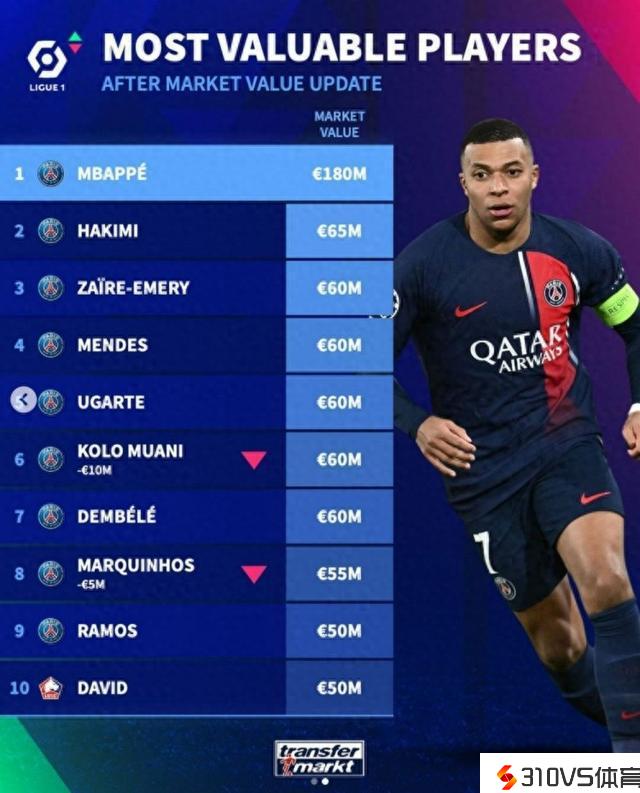 法甲最新球员身价榜:姆巴佩1.8亿欧居首,前九名均为巴黎球员